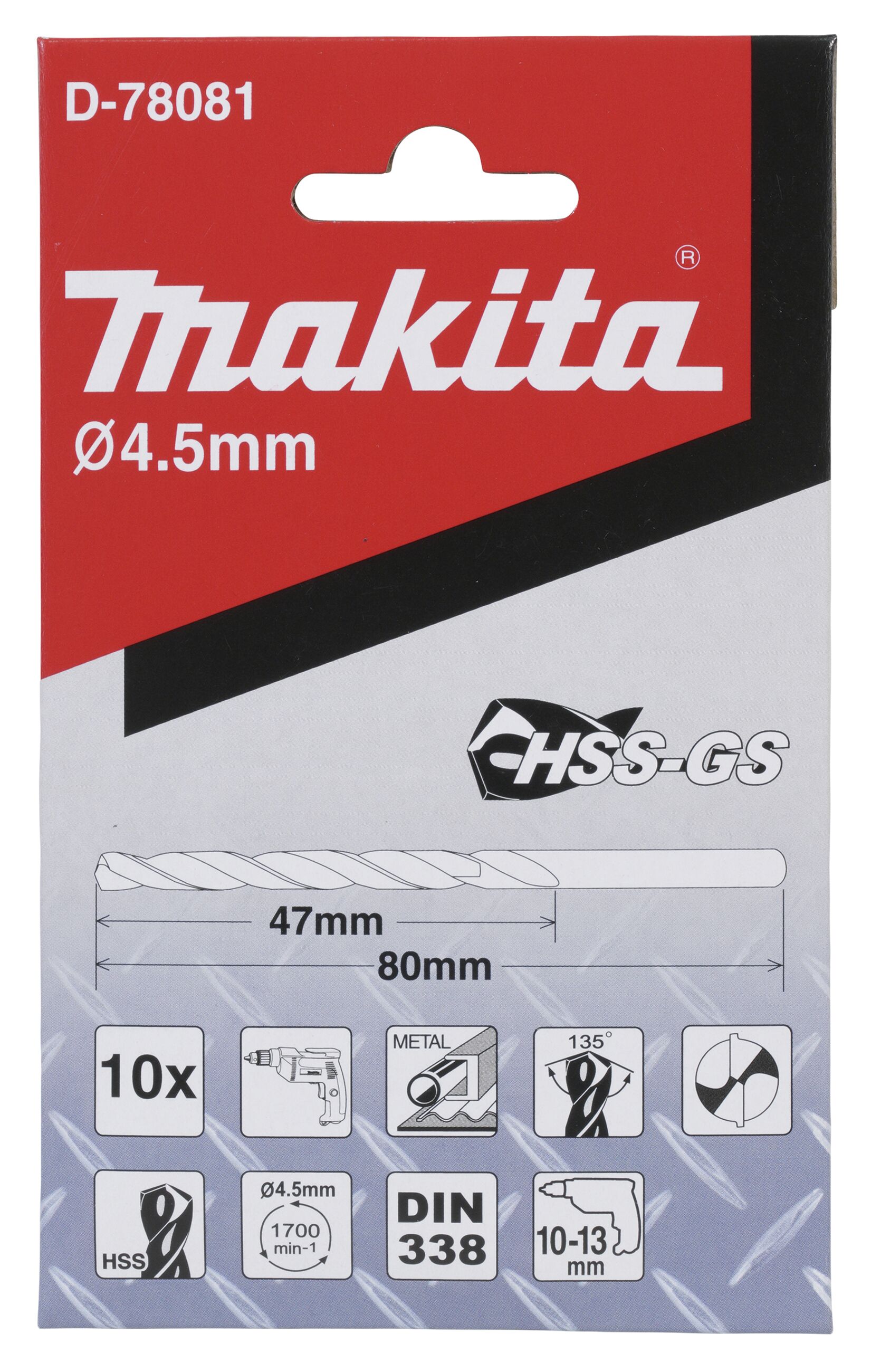 HSS-GS Metallbohrer mit optimierter Spiralnut für saubere Bohrungen, verbesserten Spanabtransport und hohe Standzeit Durchmesser ;4,5 mm Länge;80 mm Arbeitslänge;47 mm VPE;10