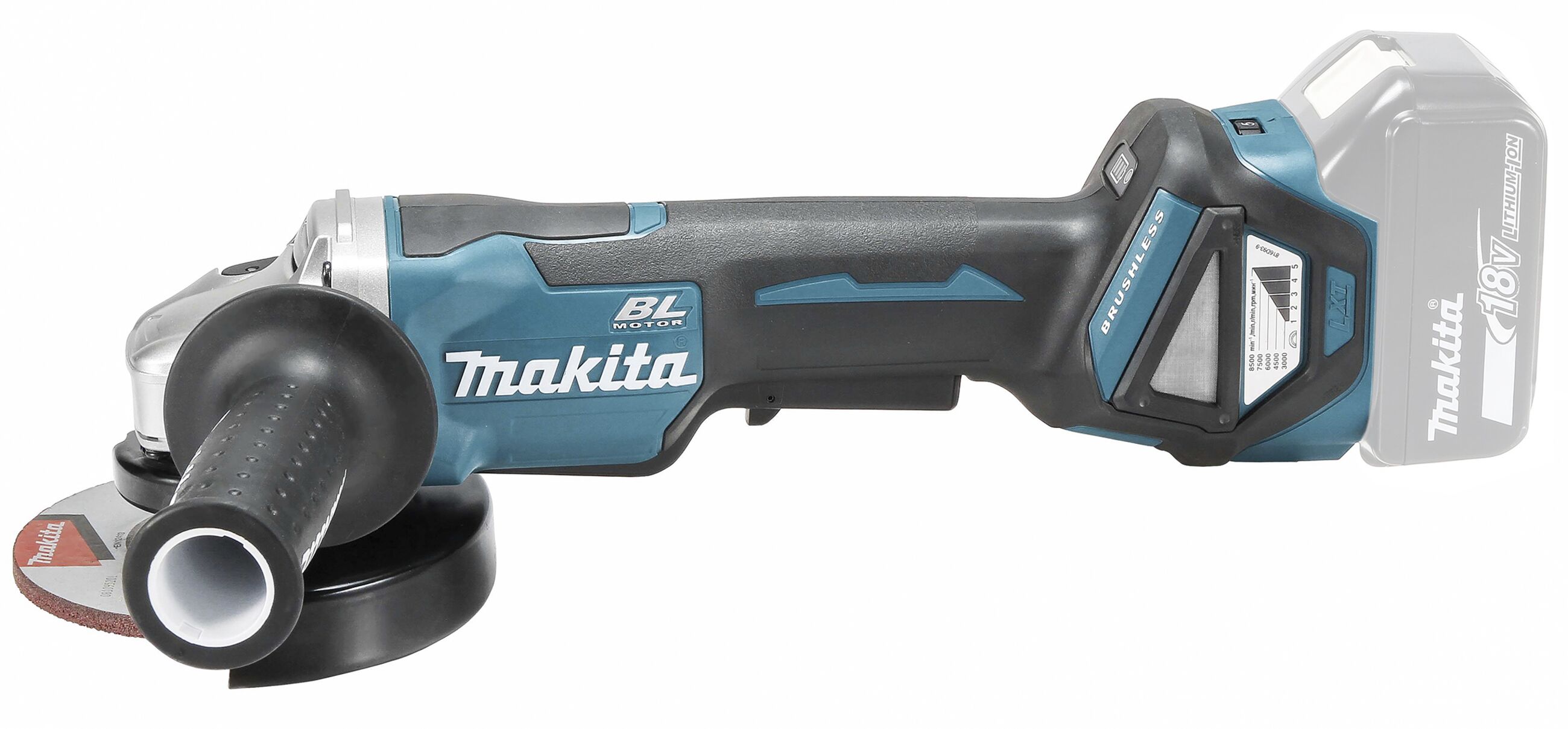 Leistungsfähiger Winkelschleifer mit bürstenlosem Motor und einstellbarer Drehzahl zum Trennen und Schleifen. Mit Paddelschalter