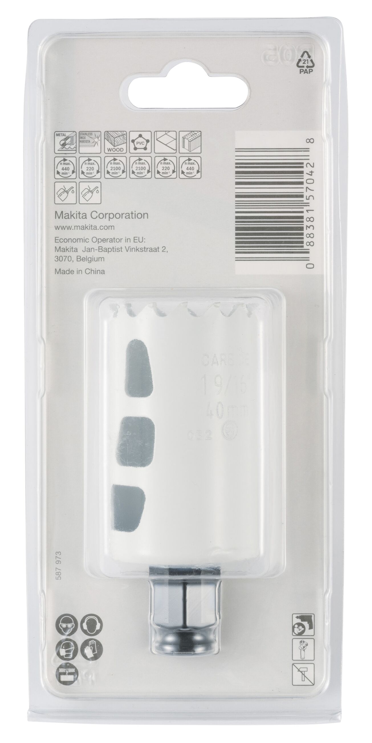 Hartmetallverzahnte Lochsäge D 40 mm für das Ezychange-Schnellwechselsystem Durchmesser ;40 mm Max. Schnittleistung;60 mm Kunststoff;2100 minâ»Â¹ Edelstahl;220 minâ»Â¹ Holz;2100 minâ»Â¹ Stahl;440 minâ»Â¹ VPE;1
